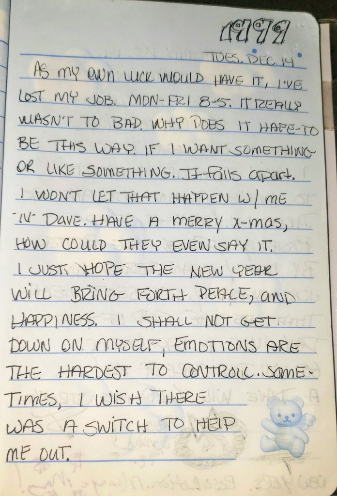 As my own luck would have it, I’ve lost my job. Mon-Fri 8-5. It really wasn’t to bad. Why does it hafe-to be this way. If I want something or like something. It falls apart. I won’t let that happen w/ me -n- Dave. Have a Merry X-mas, How could they even say it. I just hope the New Year will bring forth peace, and happiness. I shall not get down on myself, emotions are the hardest to control. Sometimes I wish there was a switch to help me out.