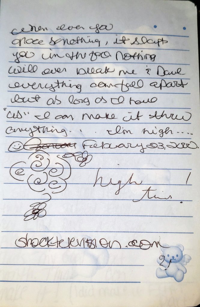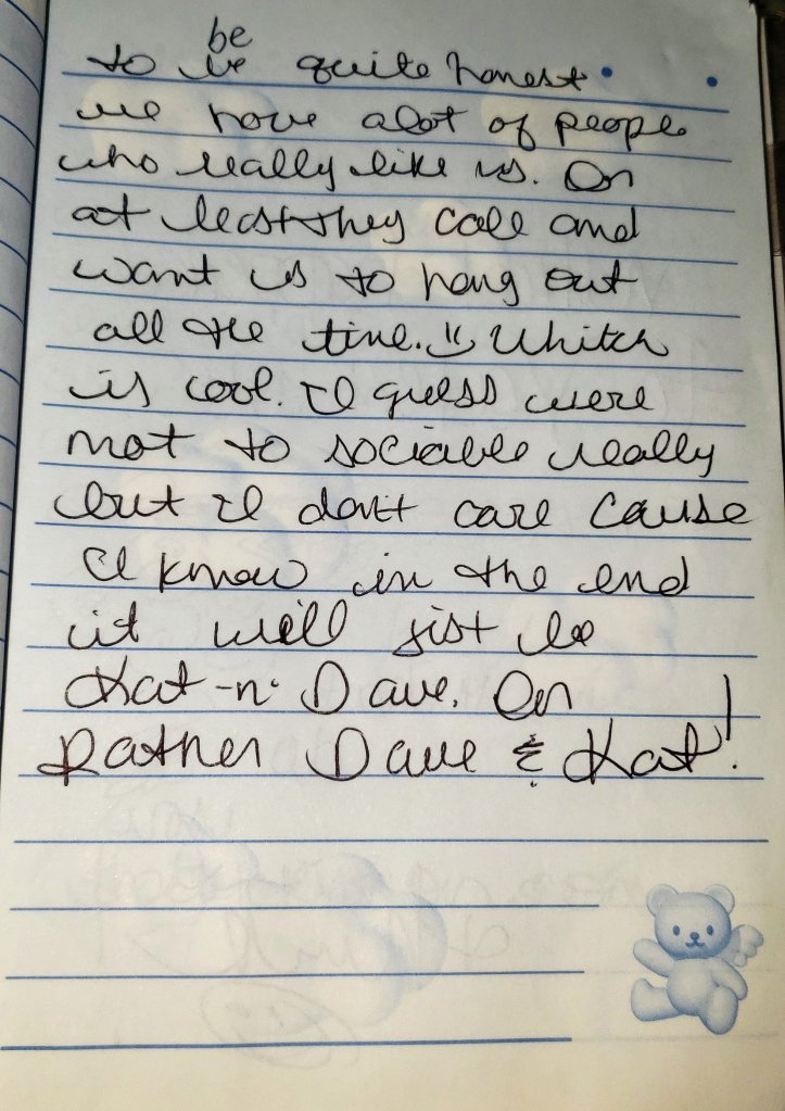 Okay. the weekend was fun. Drunk for the first time in about a year 1/2 or so. (remember I am 19 years old at this time) Don’t tell anyone though. (Really Kat- who is your journal going to “tell” SMH) It was fun. Went to Alex City. Everyone there was trying to be something they aren’t. There the people who make fun of you in public But behind closed doors they want to be your “friend” so to speak. Why can’t people just except things and each other. Everyone has good AND Bad points.